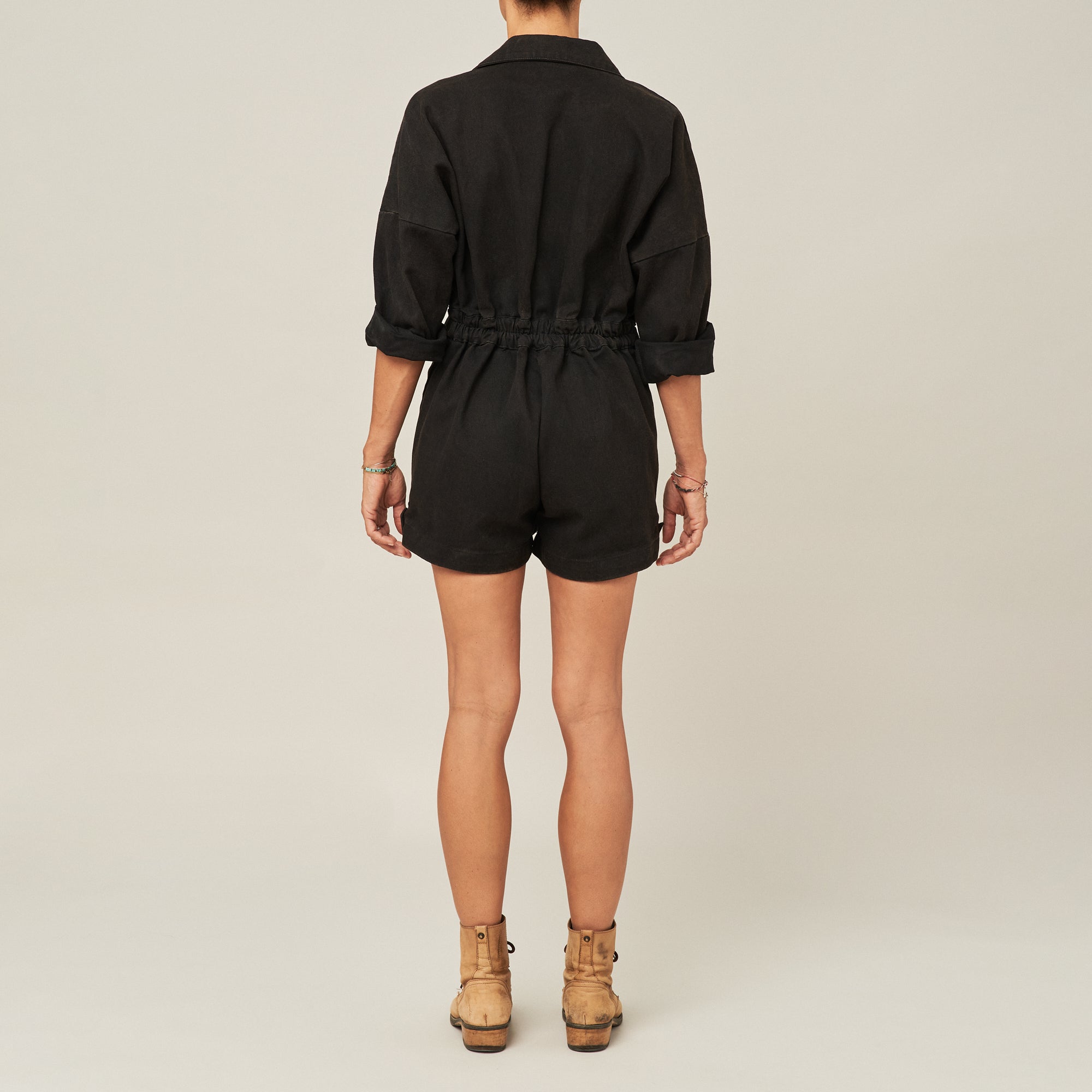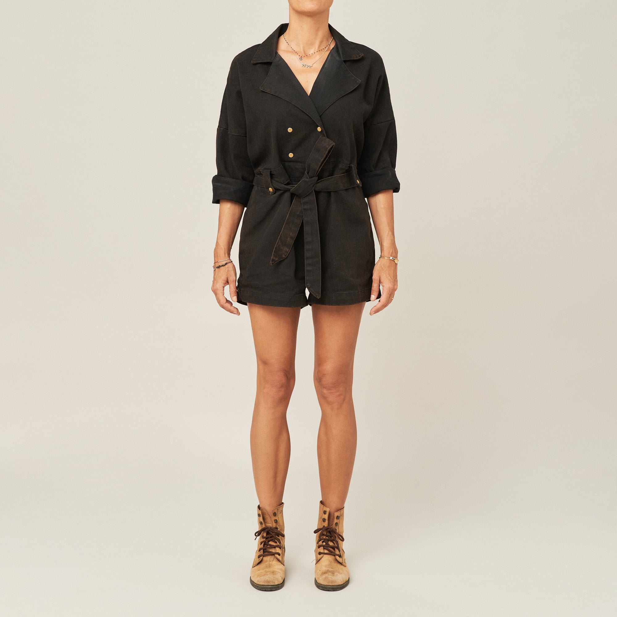 High waisted short jumpsuit with tailor collar and drop shoulders from thick denim fabric. Elasticized waistband with belt. Adjustable length with button straps.