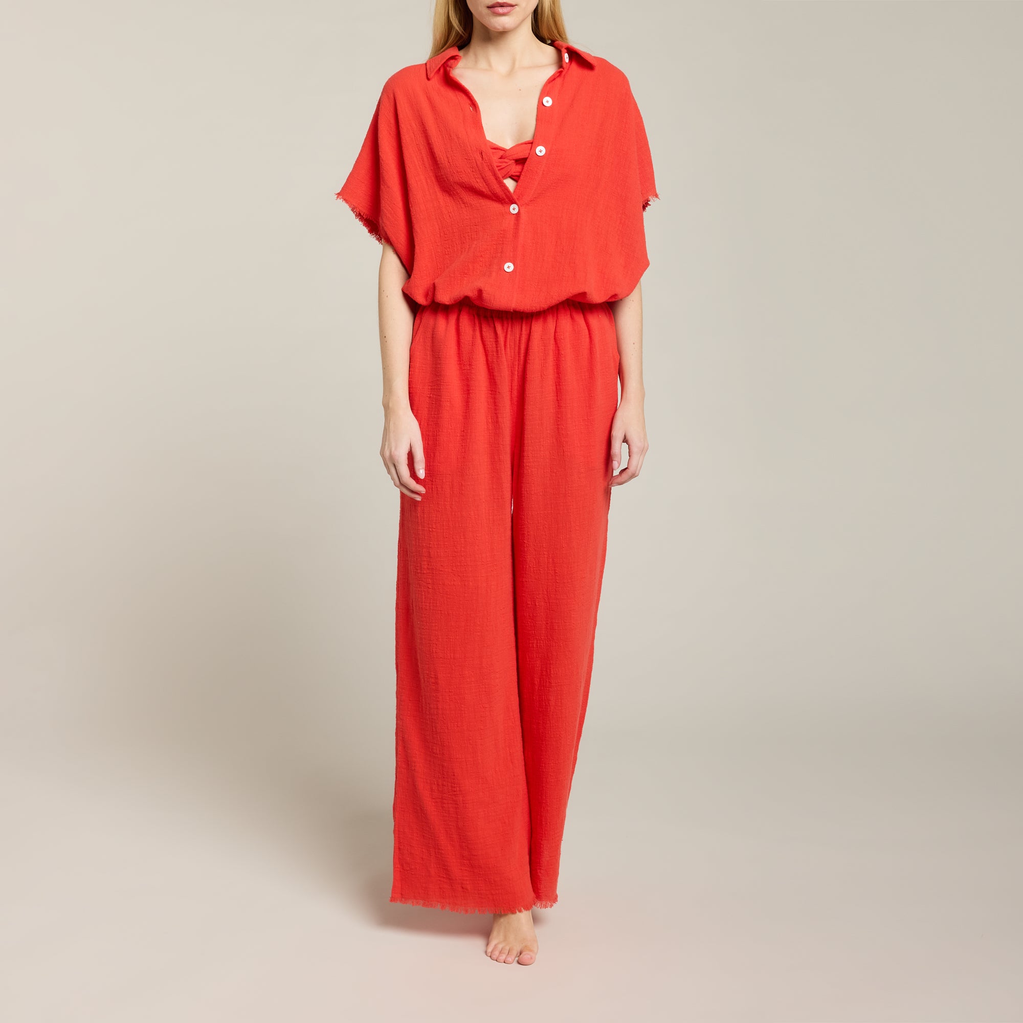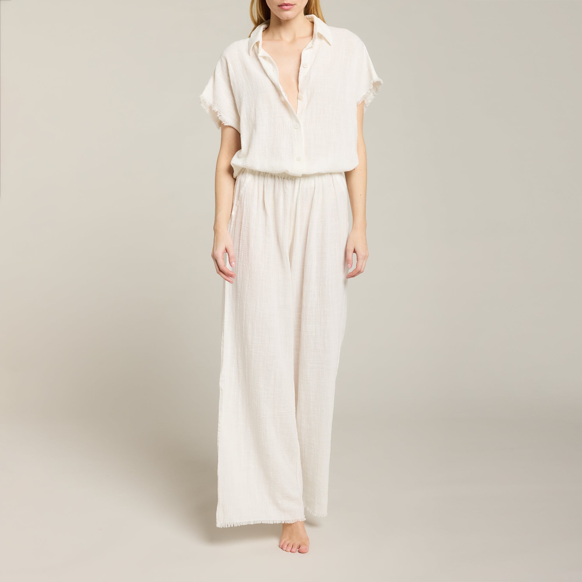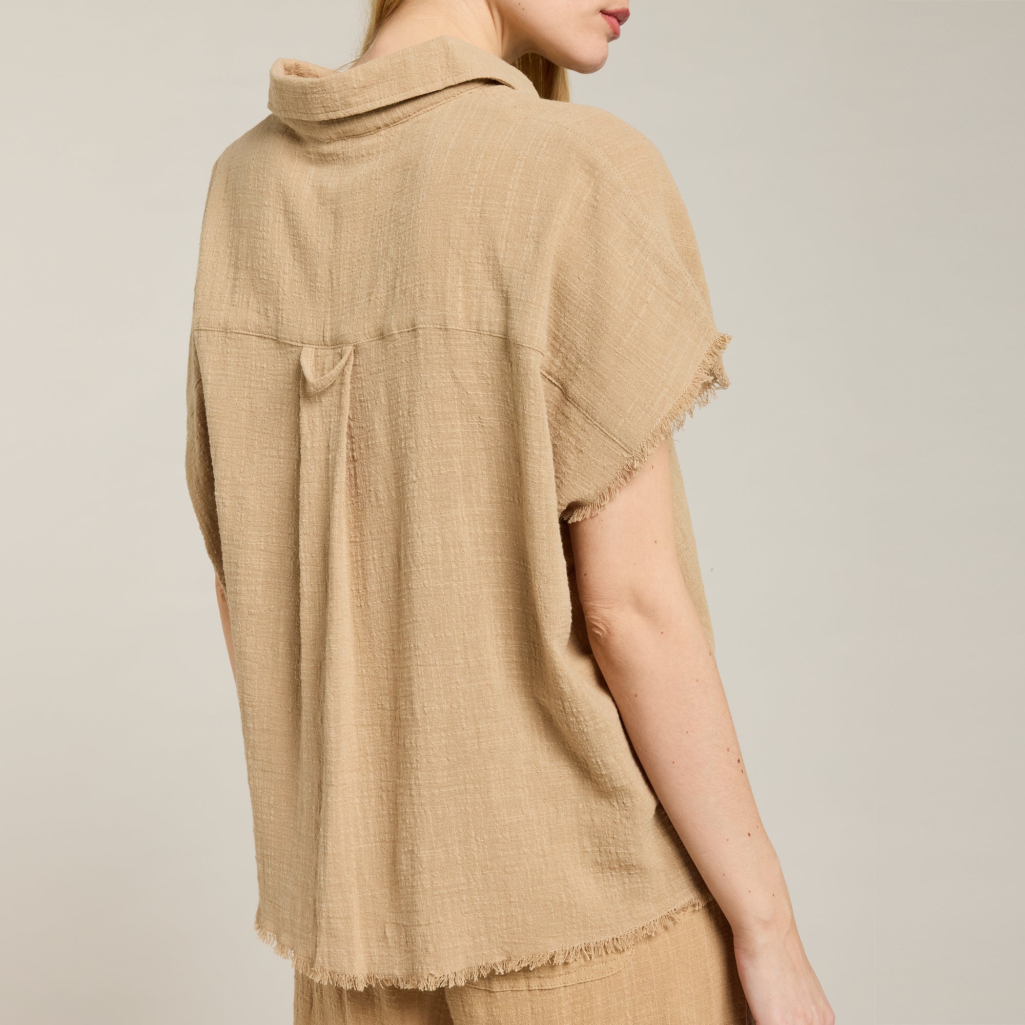 Chemise à manches courtes et tombantes en mousseline de coton doux texturé. Bord franc sur bas de chemise et manches.