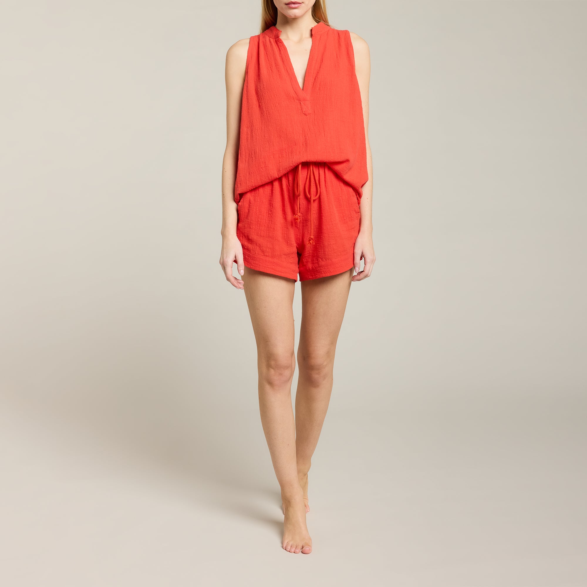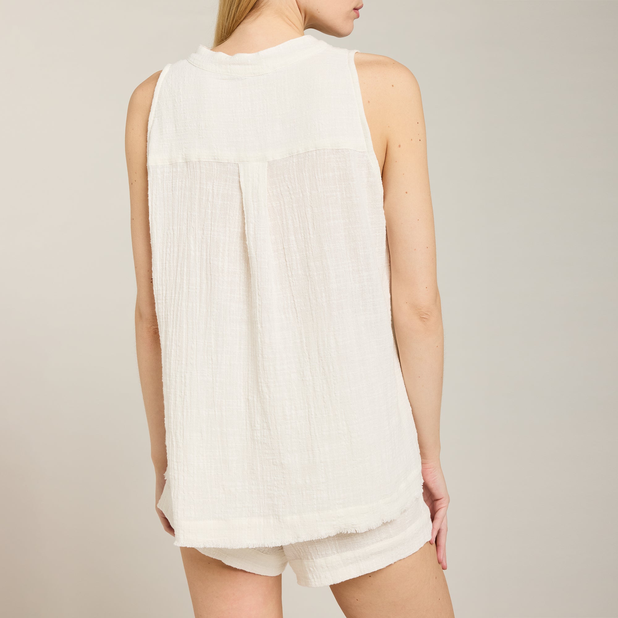 Haut sans manches en gaze de coton douce, texturée et respirante. Encolure en V style tunisien. Bord franc sur le bas. Coupe ample et décontractée.