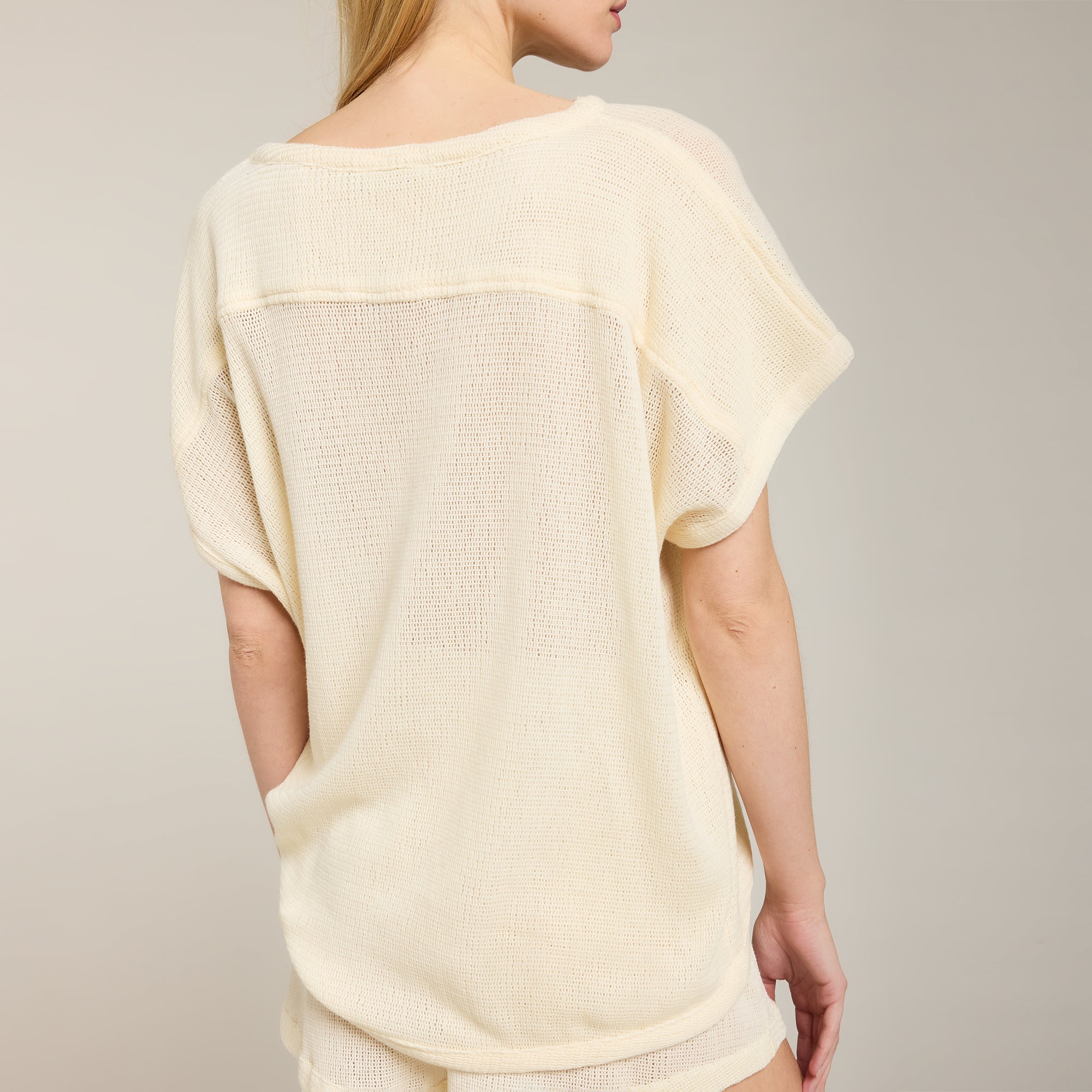 Haut à col rond et épaules tombantes en coton ajouré doux. Ourlet inversé. Coupe ample.