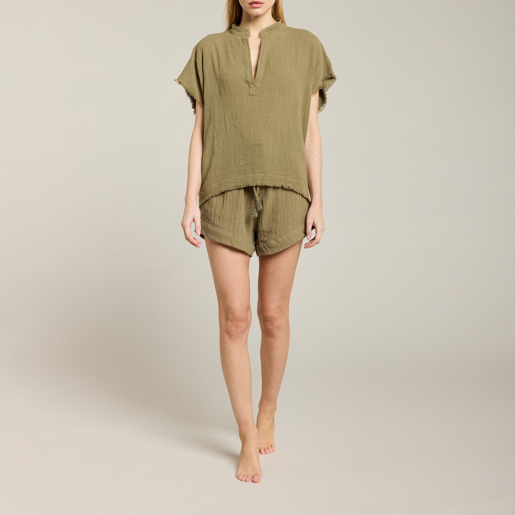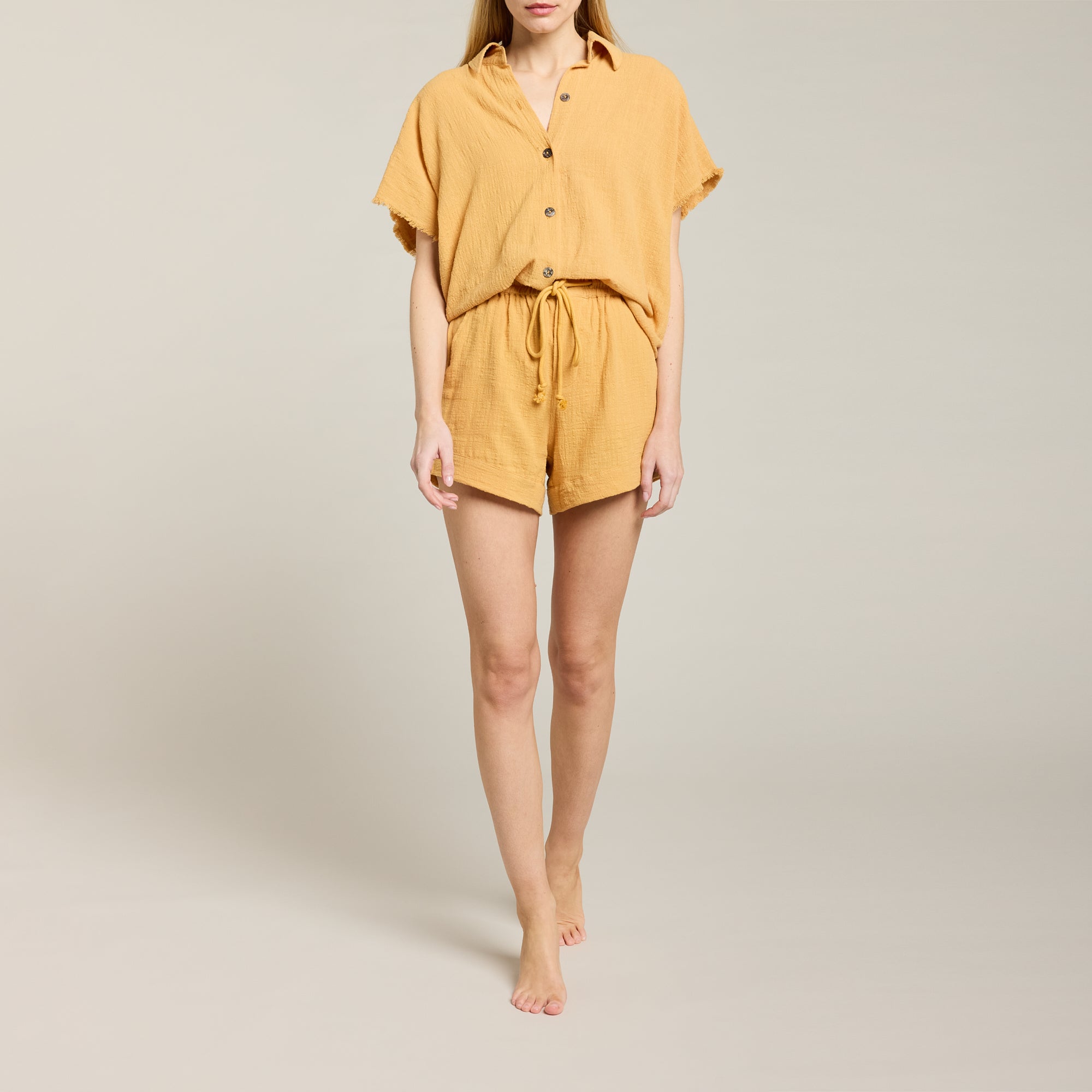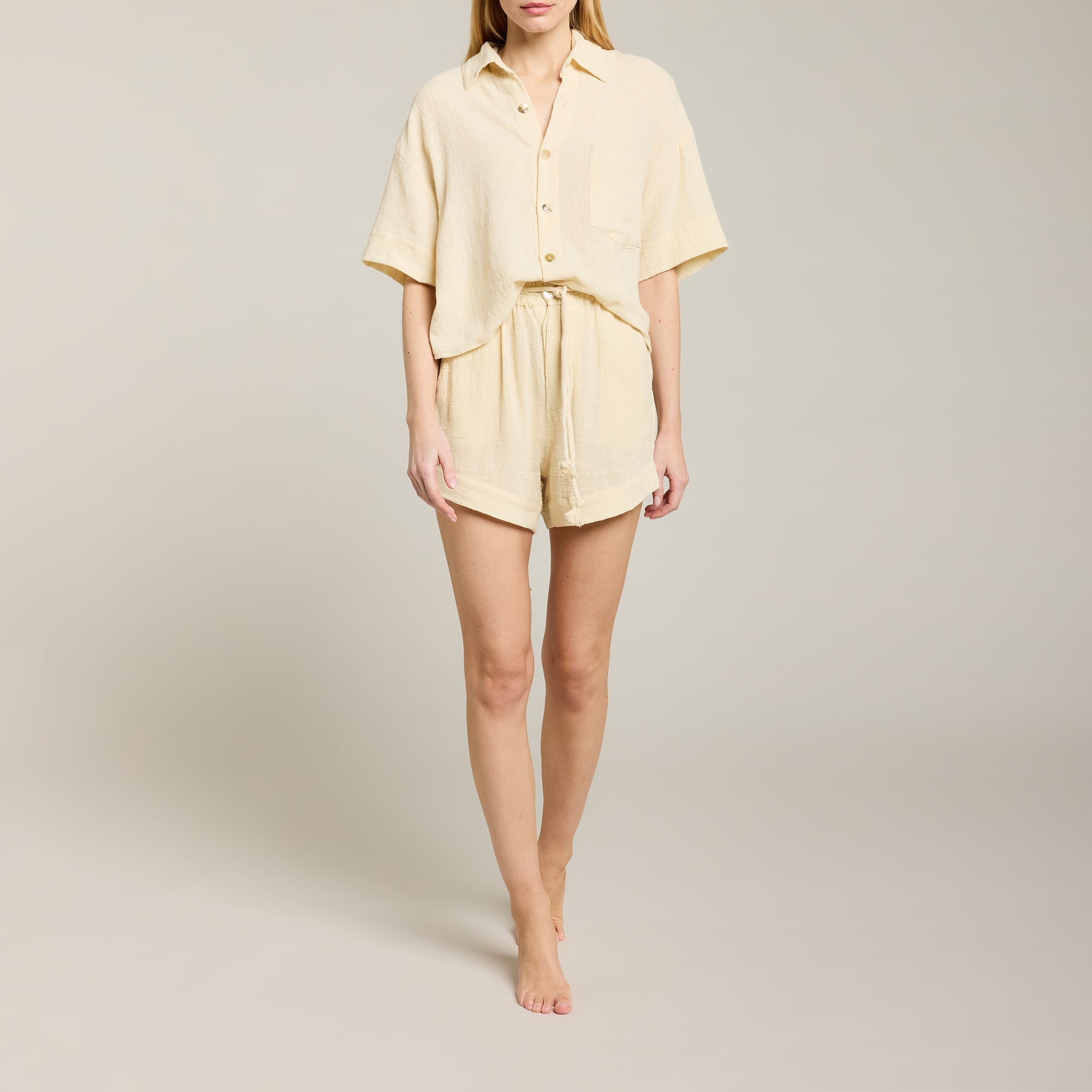 Short taille haute en mousseline de coton doux texturé, taille ajustable avec cordon de serrage et élastique intégré. Fermeture avec boutons cachés en coquillage naturel. Ourlet cousu.