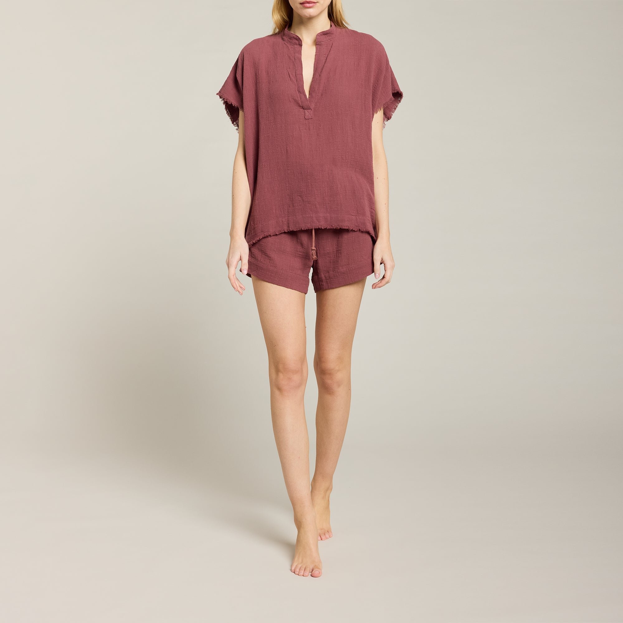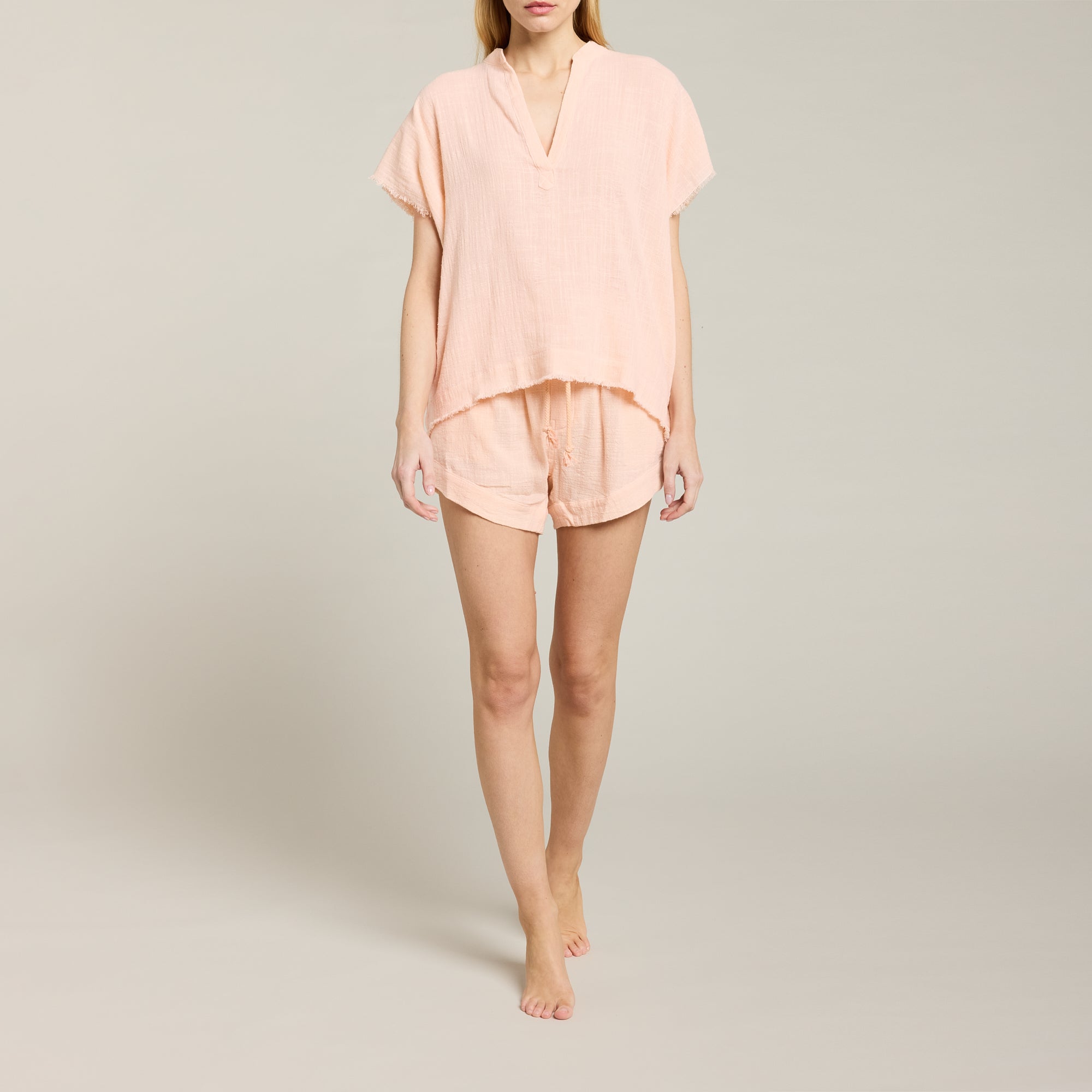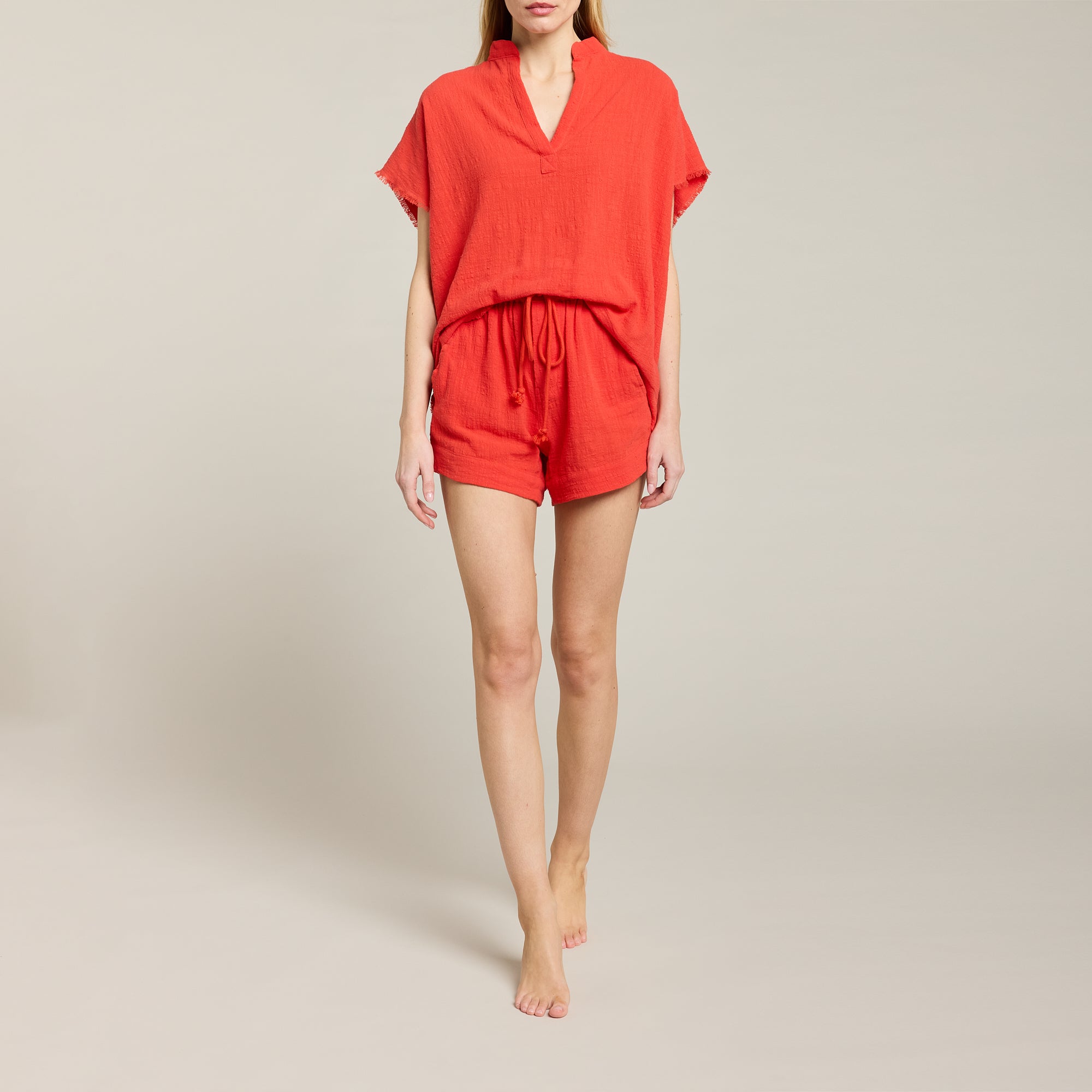 Short taille haute en mousseline de coton doux texturé, taille ajustable avec cordon de serrage et élastique intégré. Fermeture avec boutons cachés en coquillage naturel. Ourlet cousu.
